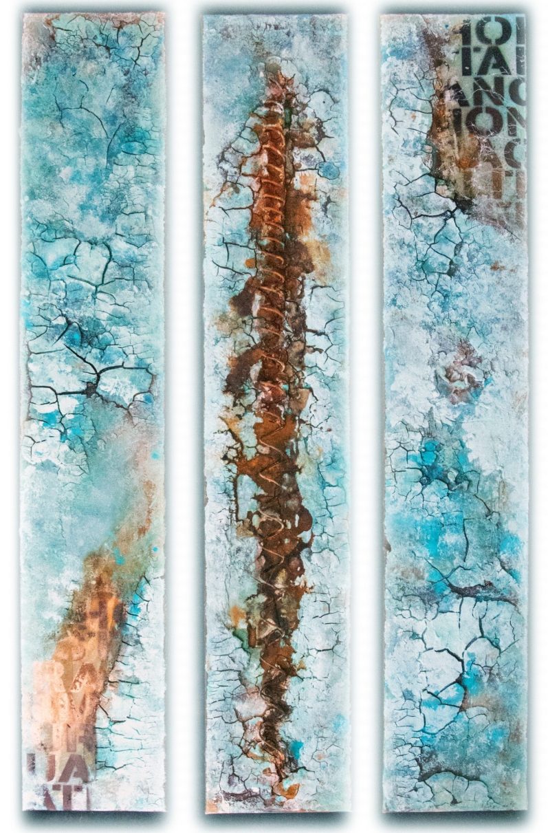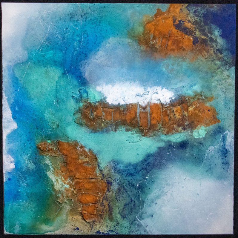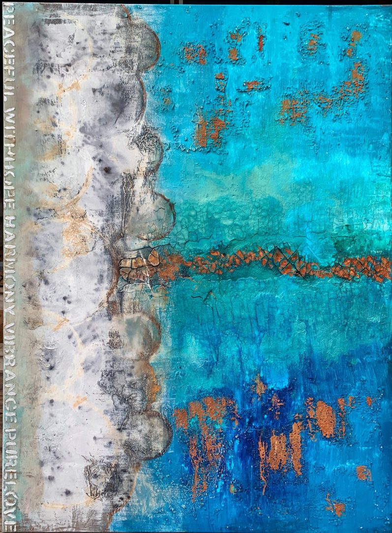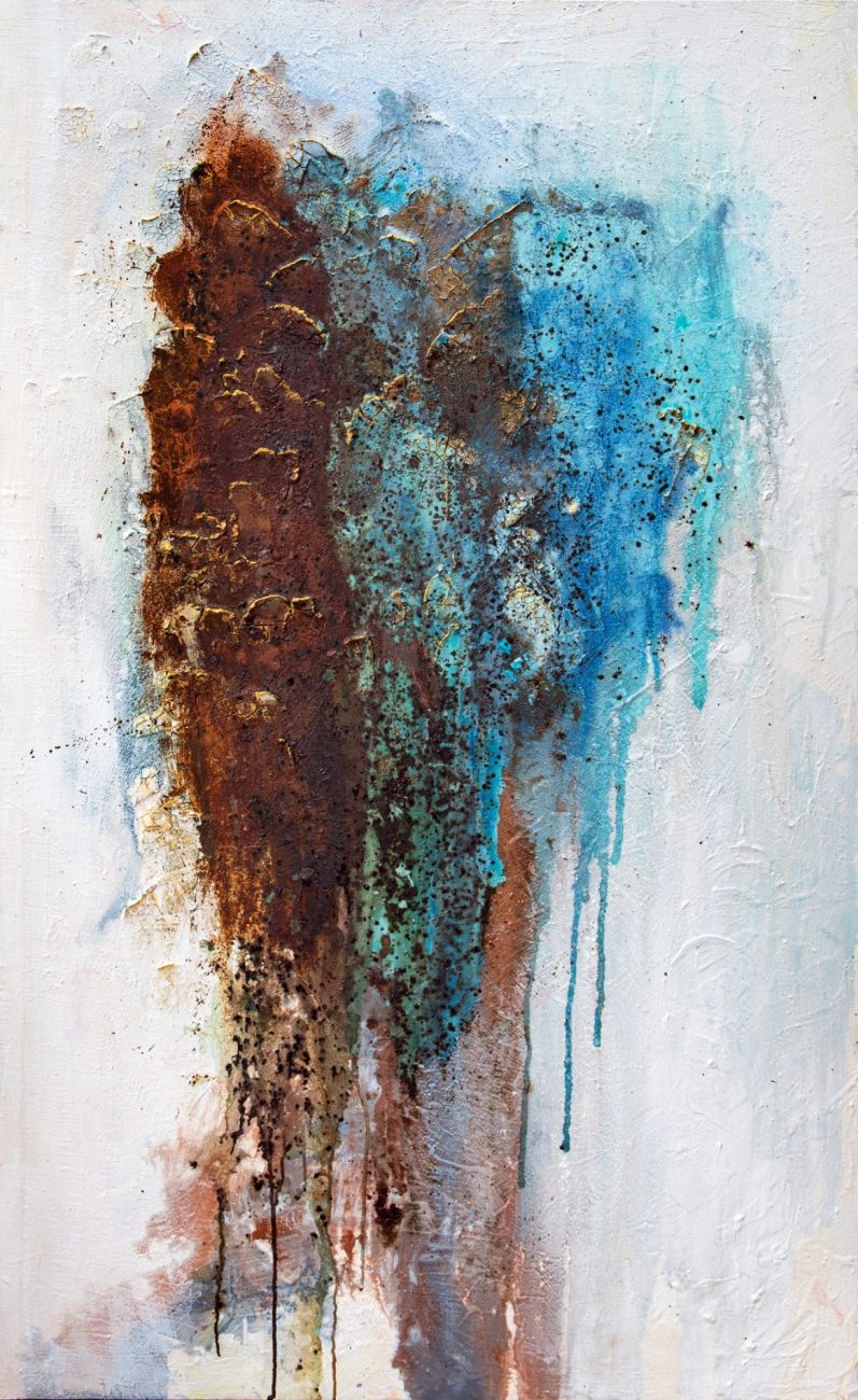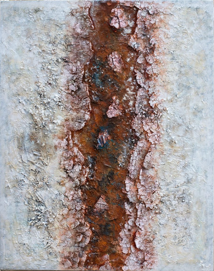 Mixed Media steht in meinen Arbeiten für das bewusste Zusammenspiel unterschiedlicher Materialien und Techniken. Marmormehl und Sumpfkalk schaffen eine erdige, mineralische Basis, während Pigmente, Beizen, Rost und Schüttungen lebendige Spuren und Tiefe entstehen lassen.